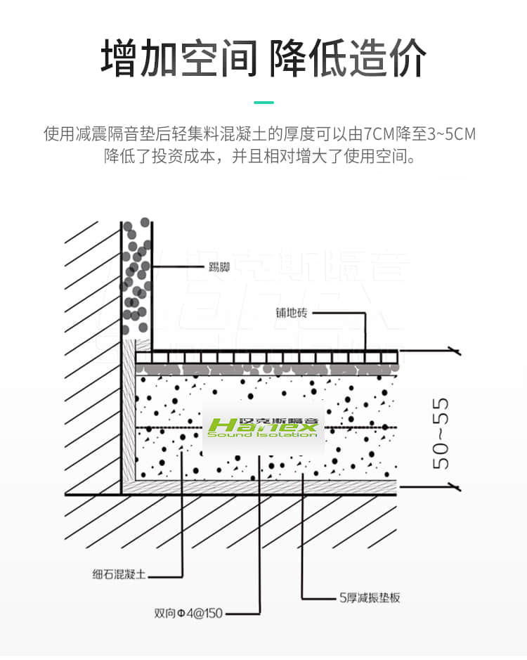 4.性價(jià)比優(yōu)勢(shì):超薄材質(zhì)不以犧牲層高為代價(jià)來(lái)?yè)Q取減振保溫的綠色達(dá)標(biāo);柔性材質(zhì)大限度避免裂縫,從而使小成本實(shí)現(xiàn)減振、保溫兩全其美。